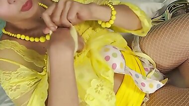 "sexy asian ladyboy strip in yellow lingerie and give blowjob"