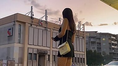 "Public walking with fishnet stockings and black dress"