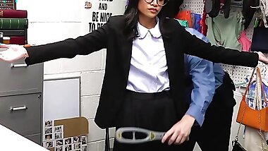 Nefarious Mall Cop Lays down for a Young Asian Thief by Banging her Pussy on his Desk - Shoplyfter